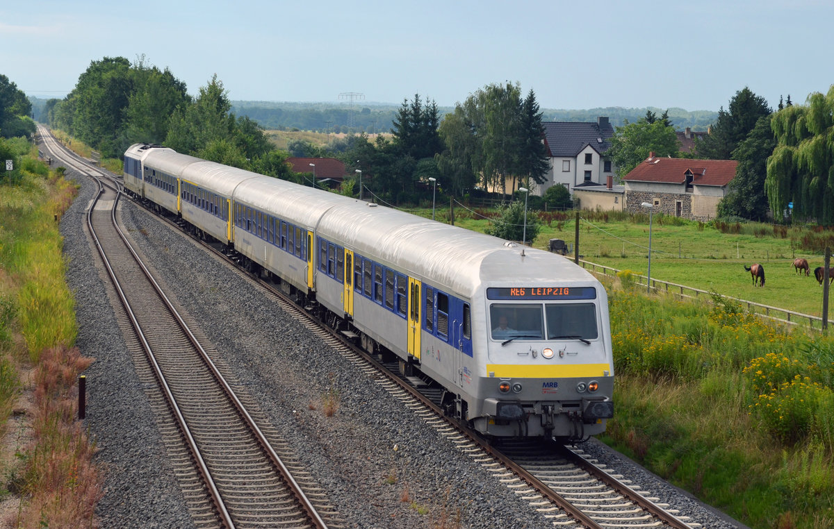 Ein RE von Chemnitz nach Leipzig, geschoben von einem Eurorunner der MRB, erreicht am 31.07.16